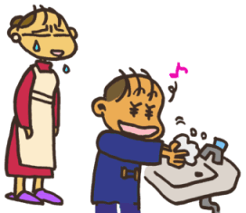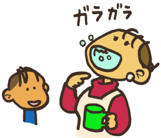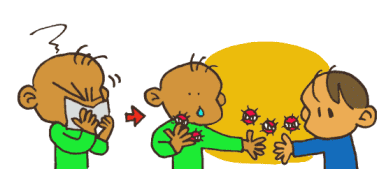 病気の人が、鼻(はな)をかむでしょ?そうすると、ティッシュをとおして、病原体(びょうげんたい)が手につくの。 その人がその手でさわったところを、海里がさわって〜、そのままの手で何かを食べたら、どうなる? インフルエンザのウイルスは、のどのおくにくっついてふえるから、うがいをしてあらっちゃうのもだいじなの。 |