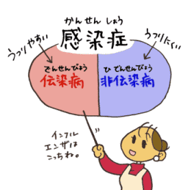 ただいま〜まま。ちょっと勉強(べんきょう)しましょうか? 海里は、「伝染病(でんせんびょう)」ってきいたことがあるかしら? ウイルスや細菌(さいきん)が体に入って増えたりして病気になるものを、「感染症(かんせんしょう)」っていうの。 他の人にうつりやすいものを「伝染病(でんせんびょう)」 うつりにくいものを「非伝染病(ひでんせんびょう)」っていって、インフルエンザは、このうつりやすい方なのよ。 |