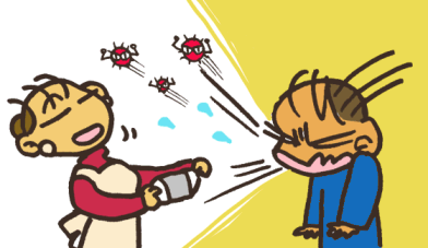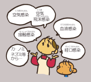 インフルエンザなんかは、「空気感染(くうきかんせん)」といって、空気(くうき)をとおしてうつるの。 タンなんかにふくまれるウイルスがくしゃみなんかで飛び散ってうつるから「空気飛沫感染(くうきひまつかんせん)」ともいうのよ。 ほかにもね、病気の人にさわってうつる「接触感染(せっしょくかんせん)」 血液(けつえき)から傷(きず)がはいってうつる「血液感染(けつえきかんせん)」 たべものをとおしてうつる「経口感染(けいこうかんせん)」食中毒(しょくちゅうどく)なんかこれね。 カ、ノミ、ネズミなんかの動物(どうぶつ)をとおしてうつる、マラリア、日本脳炎(にほんのうえん)、ペストなんかもあるわ。 |