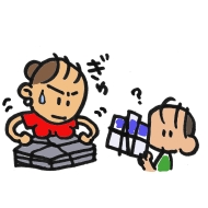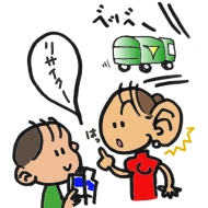 | あっ、今日は、新聞と牛乳パックをだすゴミの日だったわ。 | ねえ、どうして、新聞と牛乳パックをわけて、ゴミにだすの? | ん?これは、紙のリサイクルっていってね・・・。 | あっ、ゴミ回収車がきちゃった。ちょっと新聞と牛乳パックをゴミおきばにおいてくるから、まっててね。 |
