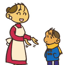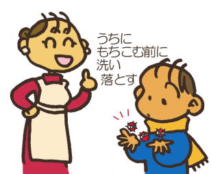 病原体(びょうげんたい)をおうちにもってかえってきて、パパやママにうつさないように、手をあらってうがいしてちょうだいな。 ![]() 病気になったら、おじいちゃんおばあちゃんのところに、新年(しんねん)の挨拶(あいさつ)にいけないわよ。 |