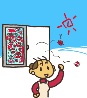 窓(まど)をあけて、空気をいれかえてしまえばいいの! だから、外で元気よくあそぶほうが、うつらなかったりするのよ。 ぎゃくに、せまいところにたくさんの人があつまる方が、うつりやすいの。病原体(びょうげんたい)がたくさんあつまっちゃうからね。 みんなに病気がうつらないように、おやすみになっちゃうの。 そうそう、インフルエンザウイルスは、せきやくしゃみでとびちるから、かかってない人より、かかっている人がマスクをして、他の人にとびちらないようにすると、うつりにくいのよ。 |