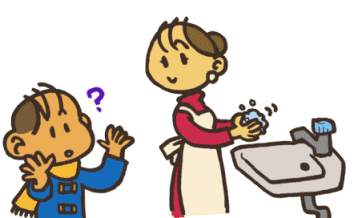 病気の人が、鼻(はな)をかむでしょ?そうすると、ティッシュをとおして、病原体(びょうげんたい)が手につくの。 その人がその手でさわったところを、海里がさわって〜、そのままの手で何かを食べたら、どうなる? インフルエンザのウイルスは、のどのおくにくっついてふえるから、うがいをしてあらっちゃうのもだいじなの。 |